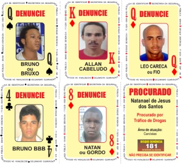 O Baralho do Crime – instrumento criado em 2011 pela Secretaria da Segurança Pública da Bahia – recebeu cinco novas cartas com rostos dos bandidos mais procurados do estado. Três naipes sofreram modificações: ‘Ouros’, ‘Espadas’ e ‘Paus’ com a finalidade de facilitar a identificação e ampliar o número de denúncias após os antigos ‘rostos das cartas’ terem sido presos ou mortos em confronto, segundo a SSP-BA.