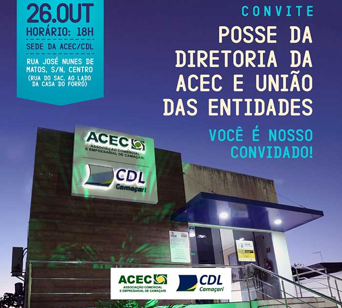 O próximo dia 26 de outubro será o início de uma nova era para Associação Comercial e Empresarial de Camaçari (ACEC) e a Câmara de Dirigentes Lojistas (CDL). Isso porque será oficializada a união das duas entidades, o que resultará em mais benefícios aos associados e poder de atuação às entidades. Durante a solenidade que começará às 18h, no auditório da ACEC-CDL, também será empossada a nova diretoria da ACEC para o biênio 2017/2019 tendo Alan Lima e Jurandi Gonçalves como presidente e vice-presidente.