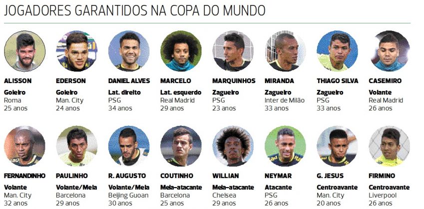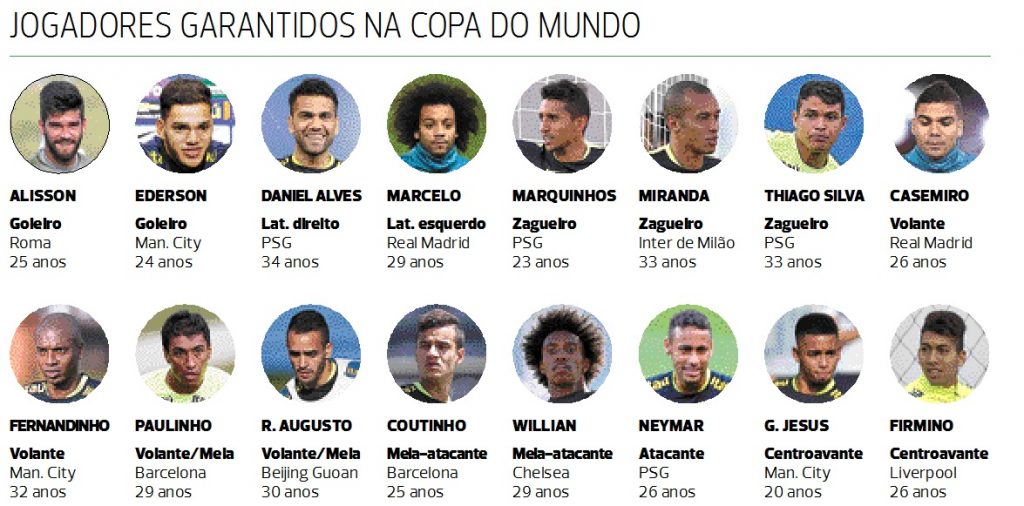 Entre as principais dúvidas do treinador estão o quarto zagueiro, o substituto de Renato Augusto no meio-campo e mais um atacante de beirada. Na última semana, Tite e a sua comissão técnica fizeram um tour pela Europa. Nomes como Danilo, do Manchester City, Alex Sandro e Douglas Costa, ambos da Juventus, foram observados. O trio disputa uma vaga entre os selecionados para a Copa.