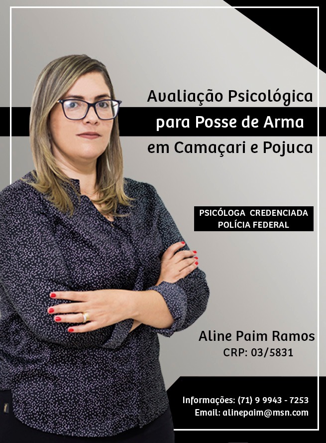 A avaliação psicológica é um dos critérios necessários para ter direito à posse de armas no Brasil. E a avaliação que comprova a capacidade psicológica de um indivíduo adquirir até quatro armas de fogo para guardar em casa, só pode ser executada por um profissional habilitado. Credenciada à Polícia Federal, a psicóloga Aline Paim Ramos, está apta para realizar esta avaliação em Camaçari e Pojuca. Além disso, ela também atua como psicóloga perita junto ao DETRAN-Ba e ao Tribunal de Justiça do Estado.