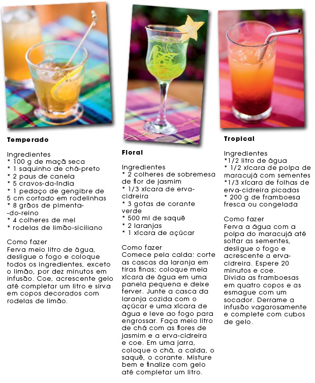 Apesar de simples, o preparo da bebida gelada não se resume a fazer chá normalmente e colocá-lo na geladeira: é preciso respeitar a proporção média de ¼ de água quente para ¾ de gelo (que deve ser adicionado depois de feita a infusão). Quem ensina é Mônica Rennó, que comanda a Talchá, loja-sensação do JK iguatemi, com mais de 70 sabores; outro endereço especializado em Sâo Paulo é a The Gourmet Tea, que só trabalha com matéria- prima orgânica. A Kusmi Tea (aquela das latinhas lindas decoradas com motivos art nouveau) agora está à venda no Brasil, na Casa Santa luzia: recém-lançado, seu kit com 12 blends feitos exclusivamente para serem consumidos gelados é ótima opção para transformar iniciantes no assunto em experts.