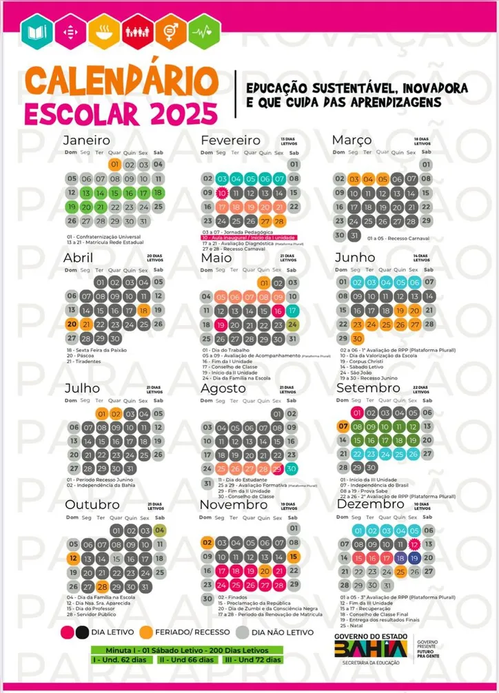 A Secretaria da Educação do Estado da Bahia (SEC) divulgou o Calendário Escolar 2025, que já está disponível para consulta no site oficial educacao.ba.gov.br. O calendário traz, também, informações detalhadas sobre as principais ações programadas para o ano letivo, garantindo organização e planejamento para toda a comunidade escolar.