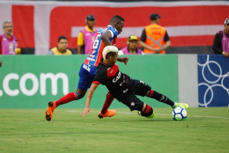 Empurrado pela torcida, o Vitória começou o clássico mais intenso, tão intenso que Léo Ceará confundiu vontade com força e tomou cartão amarelo no primeiro. O jovem de 23 anos, uma das surpresas rubro-negras no Brasileirão, mostrou que sua estreia em clássico entre os profissionais não seria apenas negativa. Aos oito minutos, ele se enfiou no meio da defesa do Bahia e desviou de cabeça cobrança de escanteio de Benítez para abrir o placar.