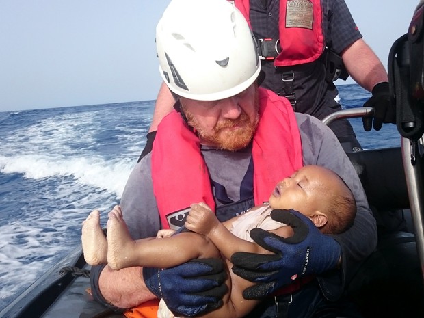 Uma foto de um bebê morto nos braços de um socorrista alemão foi distribuída por uma organização humanitária com o objetivo de pressionar autoridades europeias a garantirem passagem segura a imigrantes diante do temor de que centenas deles tenham se afogado no mar Mediterrâneo na semana passada.