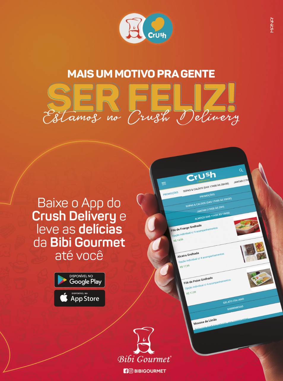 As delícias da Bibi Gourmet também podem ser acionadas através do aplicativo de delivery Crush. O novo aplicativo que promete trazer comodidade, tranquilidade e fazer seus clientes se apaixonarem pela eficiência do App.