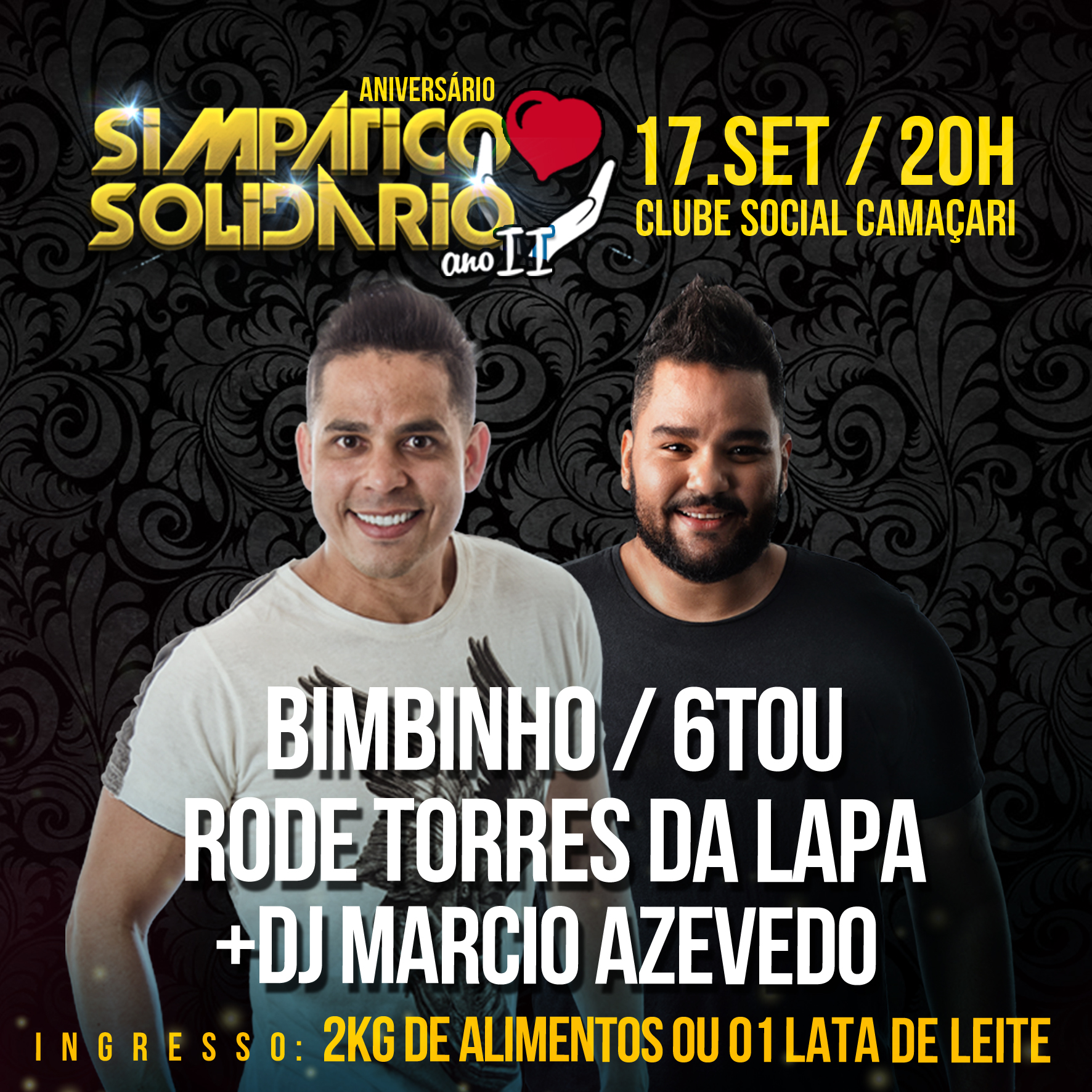 O Segundo Simpático Solidário vai contar com as participações da banda 6TOU, Rode Torres da Lapa e DJ Márcio Azevedo. O ingresso pode ser 2 kg de alimento ou 1 lata de leite.