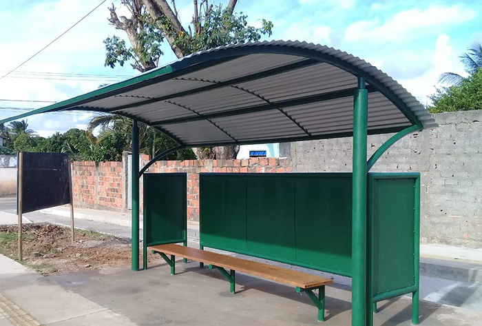 Construídas com teto amplo e banco estendido, os pontos estão adequados para proteger as pessoas do sol e da chuva, já que além da cobertura feita de aço, o abrigo possui proteção lateral.