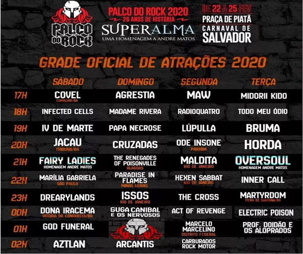 O Palco do Rock chega à 26ª edição em 2020 e este ano o espaço, localizado nos coqueirais de Piatã, homenageia o cantor e compositor André Matos, vocalista de bandas do heavy metal brasileiro como Viper, Angra e Shaman. O artista faleceu em junho do ano passado, aos 47 anos.