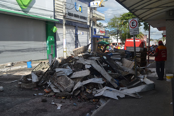 Na manhã de hoje (24), homens do Corpo de Bombeiros trabalham para retirar os escombros provocados pelo desabamento da laje da farmácia. Após isso, segundo a SSP, será iniciada a perícia que vai apontar a causa do incêndio.