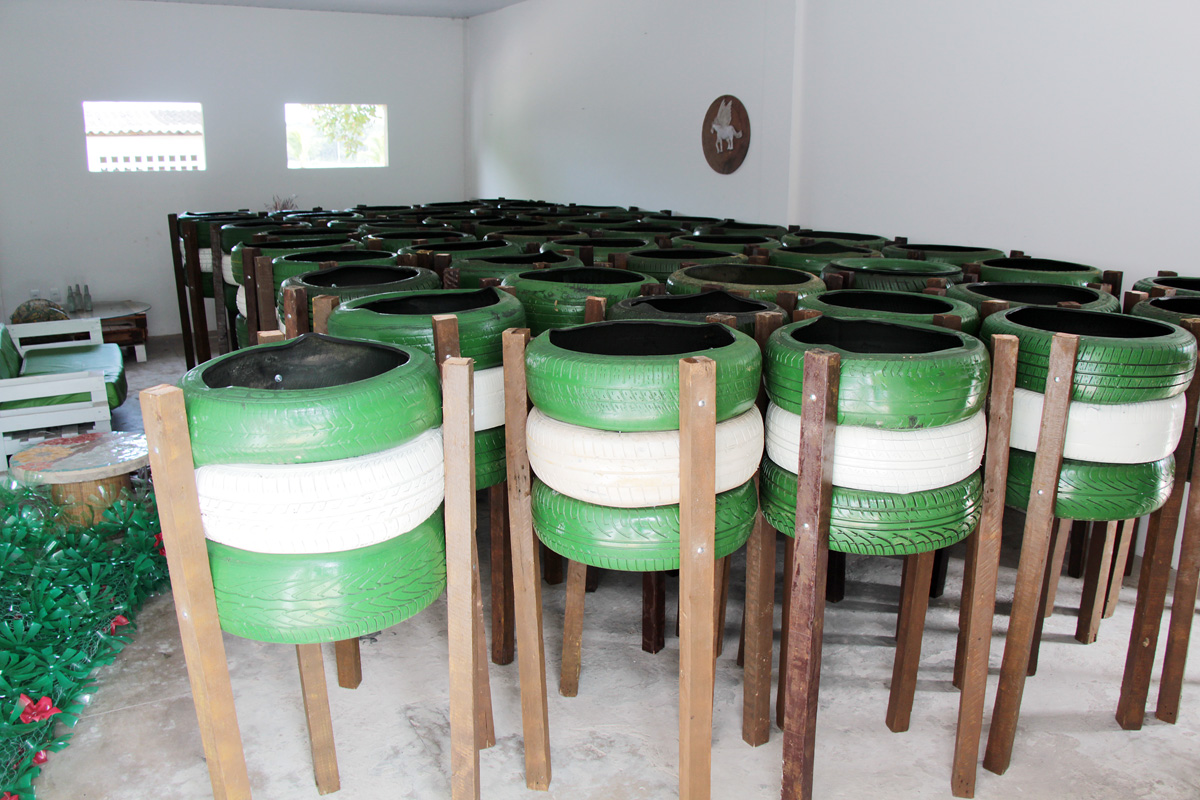 Lixeiras feitas com pneus coletados pela Limpec. Foto: Divulgação