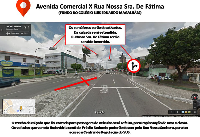 A partir deste sábado (06/05) o tráfego de veículos na Avenida Comercial, Rua Nossa Senhora de Fátima e Rua da Natividade irão sofrer alterações, conforme explicado nas imagens.