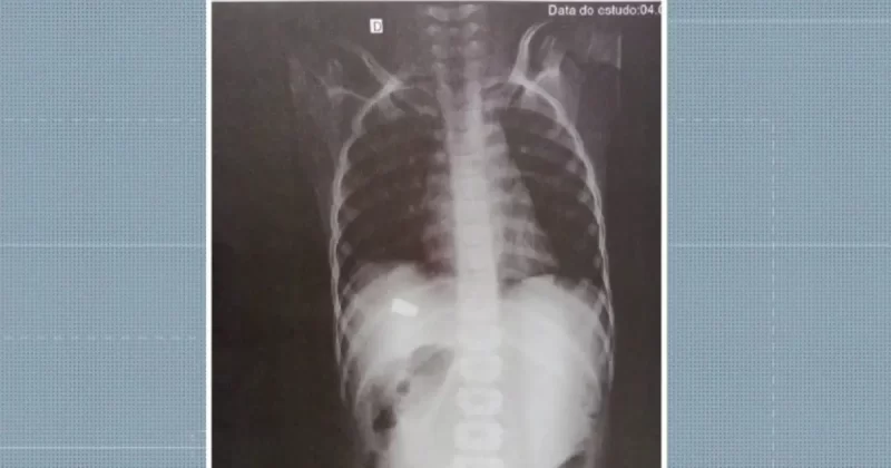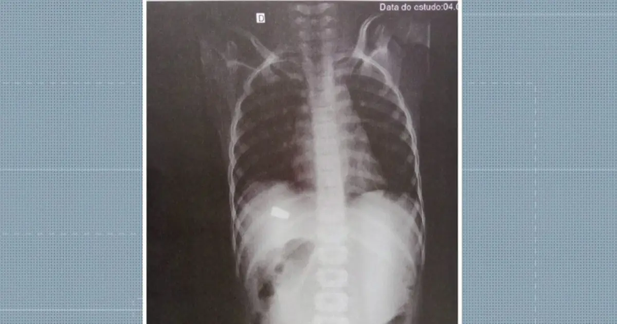 Uma imagem do raio-x do garoto mostra a região onde a vítima foi atingida pela bala. A autoria do disparo está sendo apurada pela polícia. As guias periciais foram expedidas para o entendimento do caso.