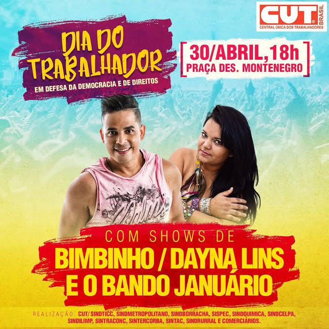 O dia do trabalhador será celebrando com shows de grandes artistas da nossa cidade. Dayna Lins, Binbinho, o Rei da Farra e Bando Januário, serão os responsáveis por fazer a alegria dos trabalhadores neste sábado, dia 30 de abril a partir das 18h na Praça Desembargador Montenegro.