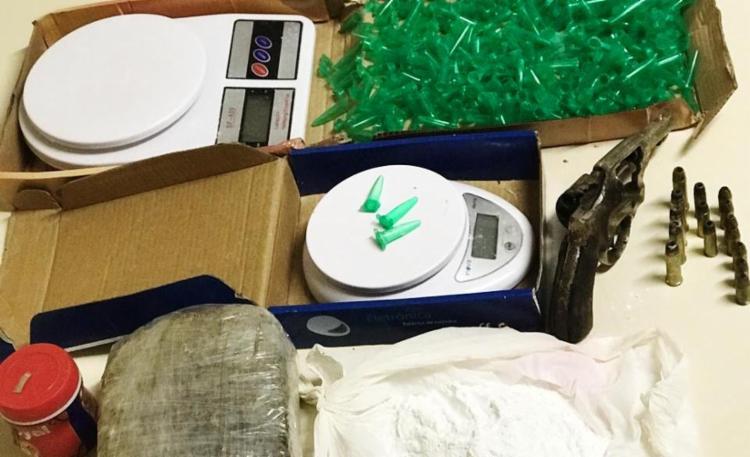 Com ele foram apreendidos meio tablete de maconha, 29 trouxas de cocaína, uma balança, embalagens plásticas, R$ 206 em espécie e quatro comprovantes de depósitos referentes ao comércio de drogas.