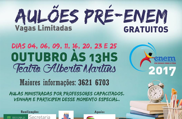 A Secretaria de Educação do Município em parceria com a Universidade Estadual da Bahia (UNEB) está promovendo uma série de “aulões” pré-Enem (Exame Nacional do Ensino Médio) voltado para os estudantes de Camaçari que pretendem ingressar numa instituição de ensino superior. Os “aulões” serão ministrados por professores especializados no exame e realizados na quarta (4), sexta (6) e nos dias 9, 11, 20, 23 e 25, sempre no Teatro Alberto Martins a partir das 13 horas.