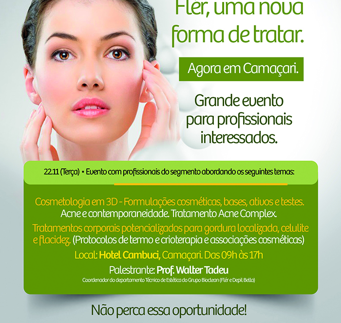 Assuntos como Cosmetologia em 3D- formulações cosméticas, bases, contemporaneidade, tratamento acne Complex, além de tratamentos corporais potencializados para gordura localizada, celulite e flacidez serão abordados no dia 22 de novembro, no Hotel Cambuci , em Camaçari, durante a Jornada Fler Dermocosméticos, das 9 às 17h.