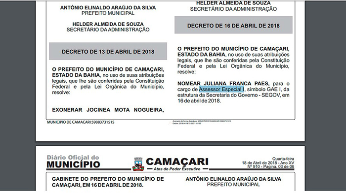 A ex-secretária de Desenvolvimento Urbano (Sedur) de Camaçari, Juliana Paes, foi nomeada para o cargo de assessora especial da secretaria de governo da prefeitura de Camaçari. A nomeação foi publicada no Diário Oficial do município de quarta-feira (18), mas o decreto foi da última segunda-feira (16).