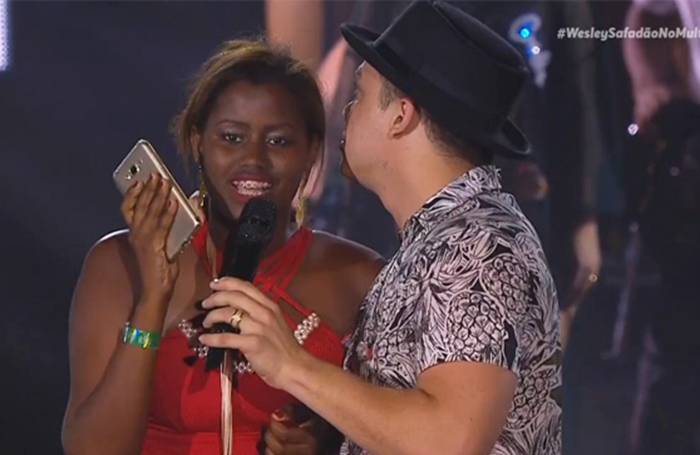 O cantor perguntou quem tinha um ex-namorado para quem queria mandar um recado e uma jovem no público se ofereceu. Ele então pediu que ela subisse para contar a história. Ela contou que terminou há um ano e o ex continua atrás dela. “E a mulher dele está aqui”, disse.