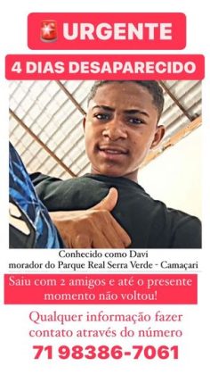 Segundo os familiares de Davi, ele saiu de casa na quinta-feira (5) com dois amigos, não falou para onde iria, e não deu mais notícias. “Estamos desesperados, a última roupa que ele usava era blusa vermelha e calça preta”, explicou um familiar.