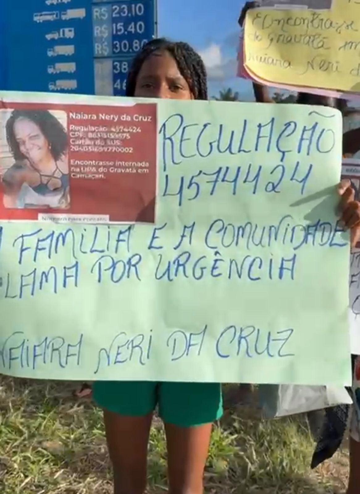 Segundo os manifestantes, Naiara está internada com um quadro gravíssimo de saúde após uma infecção dentária se espalhar e atingir o coração. A jovem aguarda regulação para ser transferida a uma unidade hospitalar com suporte adequado para tratar seu caso de saúde.
