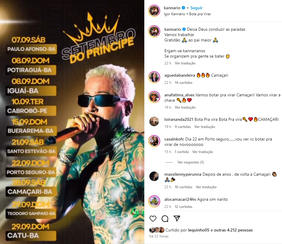 O cantor Igor Kannário, através de suas redes sociais, anunciou nesta quarta-feira(4) que estará presente na celebração do 266° aniversário da emancipação política de Camaçari,que acontece neste sábado (28). Ainda não há informações, sobre o local e horário do show, mas os fãs já estão ansiosos para apresentação do artista. “ Depois de anos, de volta a Camaçari 👏🏽🙏🏽🎉“, celebrou uma fã.