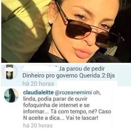 Na terça-feira (23), a cantora perdeu a paciência quando uma seguidora provocou Claudia com o assunto. Após compartilhar uma foto de óculos escuros no Instagram, a seguidora escreveu: “já parou de pedir dinheiro para o Governo né, querida? 2 bjs”.