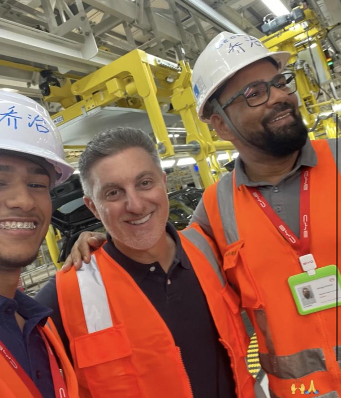 O apresentador Luciano Huck desembarcou na Bahia para visitar a fábrica da BYD em Camaçari nesta sexta-feira (10). No local, ele gravou uma entrevista com a vice-presidente global e CEO Americas e Europa da montadora chinesa, Stella Li. Ainda não se sabe quando a entrevista irá ao ar.