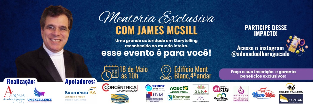 No dia 18 de maio, às 10h, no 4º andar do edifício Mont Blanc, ocorrerá um evento imperdível para todos os interessados em mentoria e desenvolvimento pessoal. A dona do olhar aguçado tem o prazer de trazer para Camaçari uma mentoria exclusiva com o renomado James Mcsill.