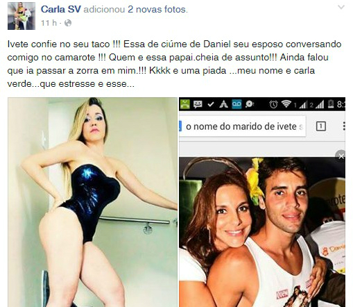“Ivete confie no seu taco!! Essa de ciúme de Daniel seu esposo conversando comigo no camarote !!! Quem é essa papai cheia de assunto? Ainda falou que ia passar a zorra em mim.!!! Kkkk é uma piada …meu nome é Carla verde…que estresse é esse?”, escreveu a moça, que em seu perfil na rede social aparece em um relacionamento sério.