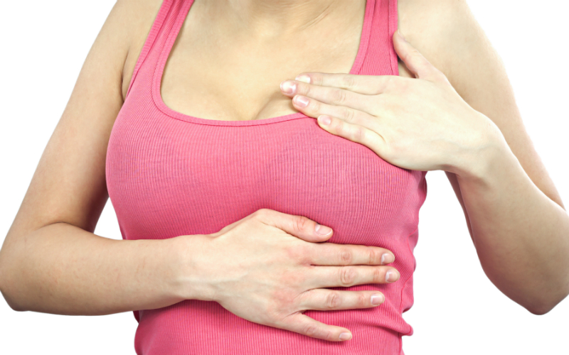 Sem roupas, observe os seios com os braços caídos, levantados e dobrados atrás do pescoço e com as mãos na bacia, pressionando-a para verificar se existe alteração na superfície da mama. É importante avaliar o tamanho, a forma e a cor, além de inchaços, saliências e rugosidades.