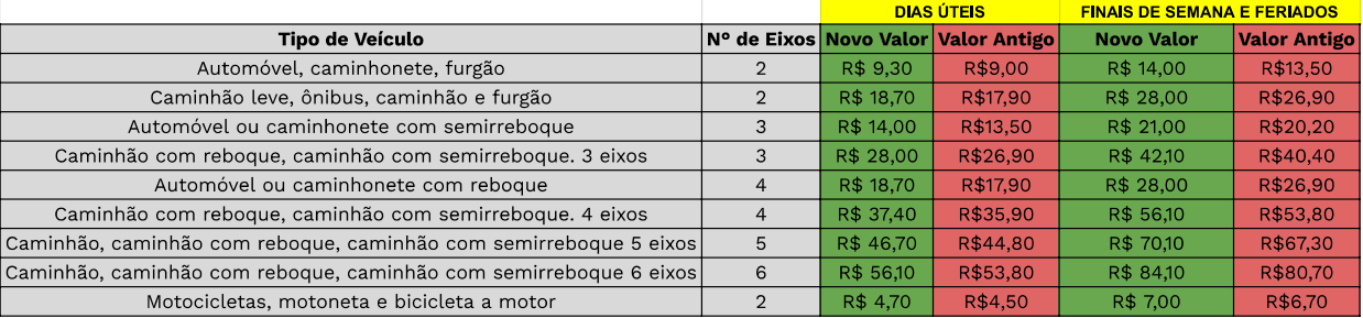 Para a categoria “automóvel, caminhonete, furgão”, durante a semana, houve um aumento de R$ 0,30 e de R$ 0,50 aos finais de semana. Para “Motocicletas, motoneta e bicicleta a motor”, os acréscimos foram de R$ 0,20 e R$ 0,30, respectivamente. Veja a tabela: