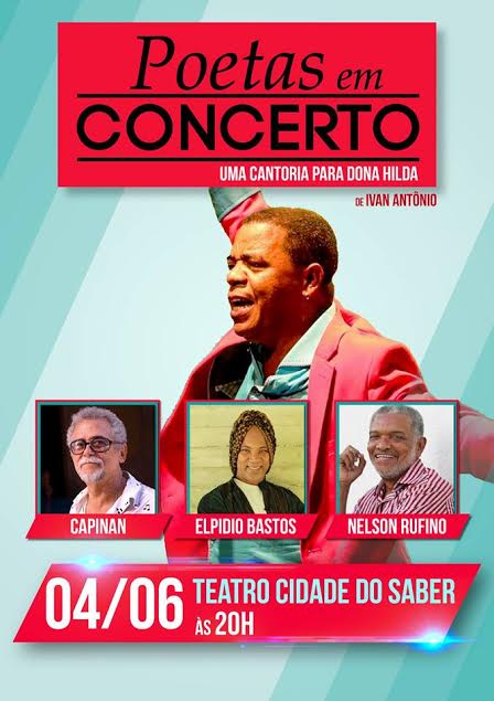 O Teatro Cidade do Saber (TCS) recebe, neste sábado (04/06), às 20h, o projeto Poetas em Concerto. Idealizada pelo poeta, compositor, cantor e cineasta, Ivan Antônio, a iniciativa está na segunda edição e, desta vez, recebe como convidados o poeta José Carlos Capinan, o músico Elpídio Bastos e o mestre Nelson Rufino.