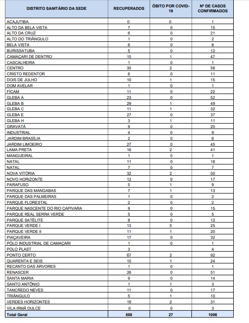 De um modo geral, no Distrito Sanitário SEDE, os bairros com maior incidência do vírus são Ponto Certo com 96 casos, Centro com 66 casos e Renascer (Phoc II), com 51 casos.
