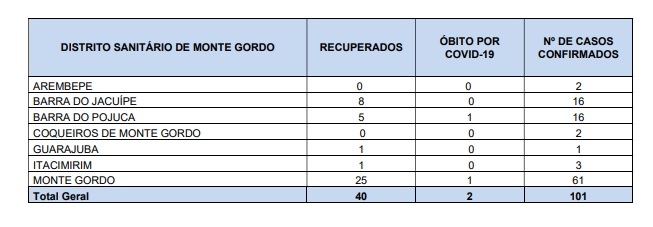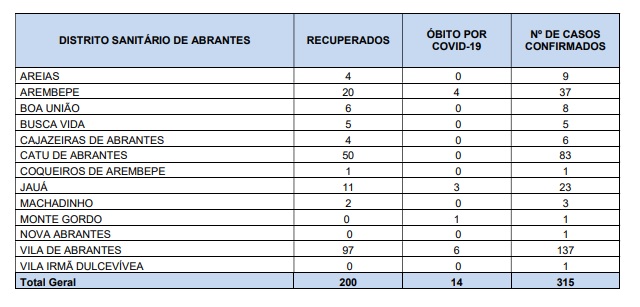 Em Abrantes ABRANTES, os bairros com maior número de casos confirmados são: Vila de Abrantes com 144 casos seguidos por Catu de Abrantes com 93 casos e Arembepe com 38 casos. Em relação ao Distrito Sanitário MONTE GORDO, destacam-se Monte Gordo com 61 casos, Barra de Jacuípe e Barra do Pojuca com 16 casos cada.