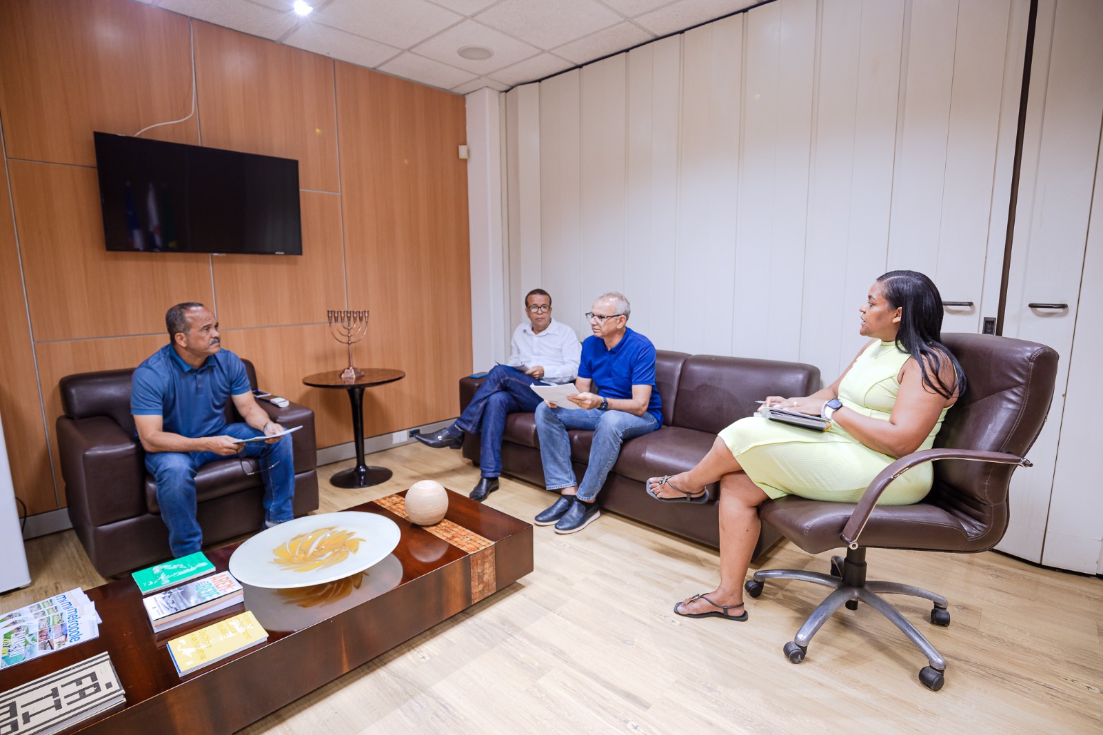 “Vamos nos empenhar para garantir aos servidores o pagamento dos salários em dia”, afirmou o prefeito, se dirigindo ao titular da Secretaria da Fazenda (Sefaz), Joaquim Bahia, que veio apresentar ajustes de contas e um apanhado dos números fiscais atuais. O secretário André Anilton e a subsecretária Joice Costa, da Secretaria da Administração (Secad), também participaram do encontro.