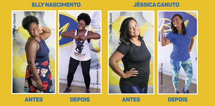 Jéssica Canuto, 29 anos, entrou no projeto com 76,1 kg, uma idade corporal correspondente a uma mulher de 49 anos. Elly Nascimento, 33 anos, marcou na balança de Bioimpedância 94 kg antes de iniciar o tratamento, ou seja, idade corporal de 57 anos. O desafio foi lançado elas abraçaram a oportunidade e, literalmente, suaram a camisa.