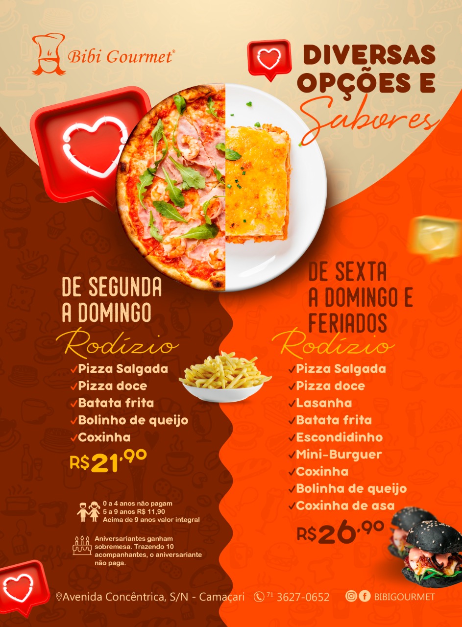 Já de sexta a domingo e feriados, as opções aumentam: pizza salgada, pizza doce, lasanha, batata frita, escondidinho, mini-burger, coxinha, bolinho de queijo e coxinha de asa. Nesses dias, o rodízio sai por R$ 26,99 por pessoa.