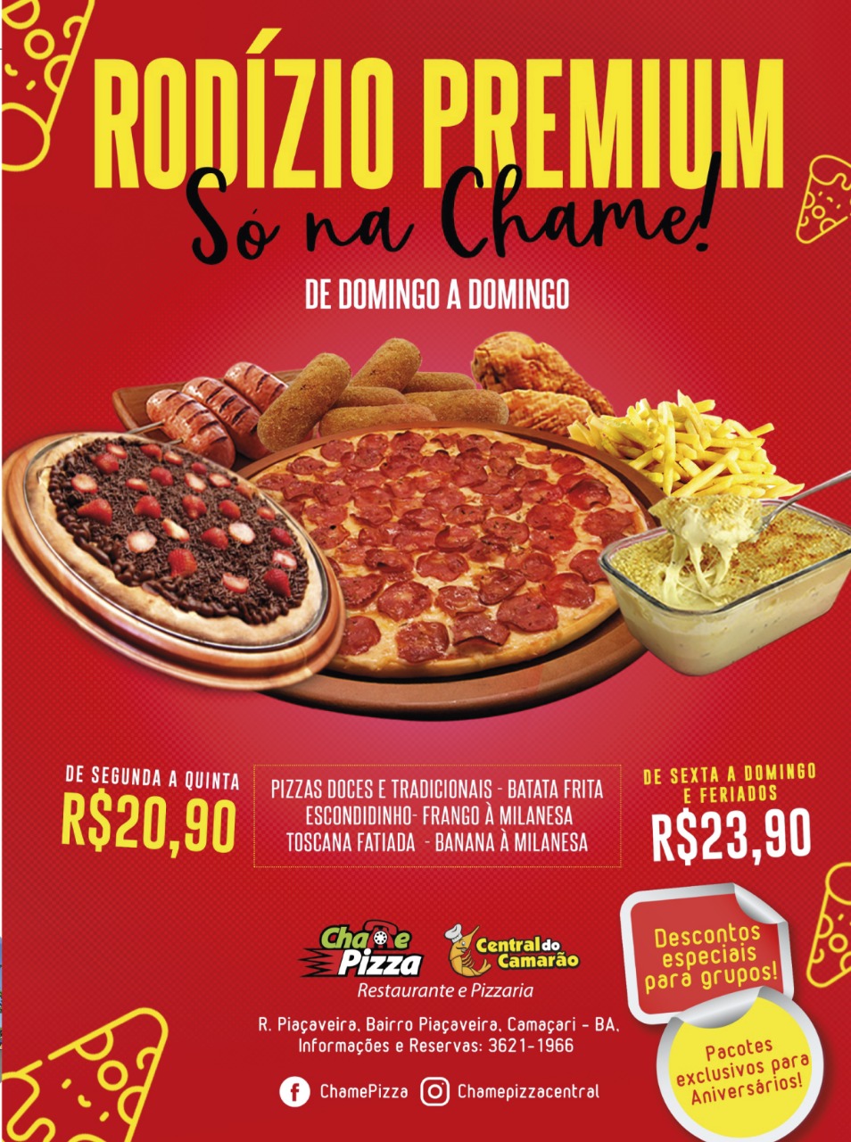 Sabe aquela vontade de comer uma pizza com uma massa macia e suculenta? O desejo pode ser realizado só na Chame Pizza! São mais de 20 anos de tradição na cidade com sabores tradicionais, pizzas doces, rodízio acompanhado de fritas, escondidinho. frango à milanesa, toscana fatiada e banana a milanesa.