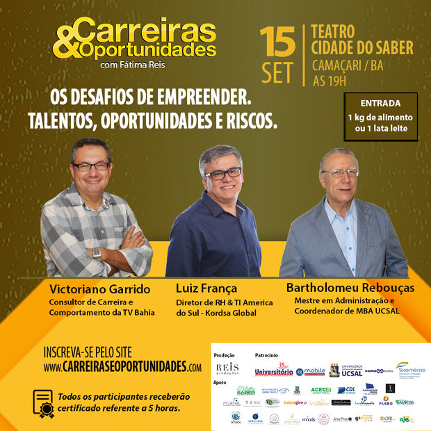 Pensando nisso, o Talk Show Carreiras e Oportunidades com Fátima Reis, vai abordar a temática ‘Os desafios de empreender. Talentos, Oportunidades e Riscos’ com um trio de especialistas, o Consultor de carreiras e comportamento Victoriano Garrido, o Diretor de RH e TI América do Sul Kordsa Global Luiz França e o Mestre em administração e Coordenador de MBA UCSAL, Bartholomeu Rebouças. Esses profissionais irão orientar na arte de empreender neste mercado competitivo. O evento acontecerá nesta quinta (15) às 19h, no Teatro Cidade do Saber, em Camaçari.