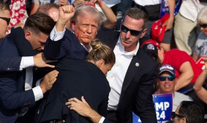 Trump estava fazendo um comício na cidade de Butler, na Pensilvânia, quando foi alvo do atentado. Um vídeo registrou o exato momento em que o ex-presidente reage ao ouvir tiros de arma de fogo.