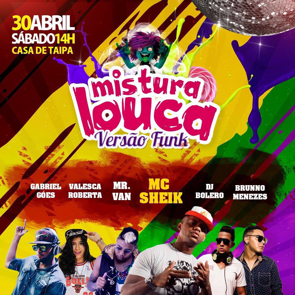 Neste sábado(30), acontece na Casa de Taipa, em Camaçari, “Mistura Louca – Versão Funk, a mistura perfeita para sua diversão!”. O evento vai contar com a apresentação dos MC’s MC Sheik (considerado como o melhor no estado), MC Maikisson e dos DJs: Valesca Roberta, Brunno Menezes, Gabriel Góes e Bolero DJ.